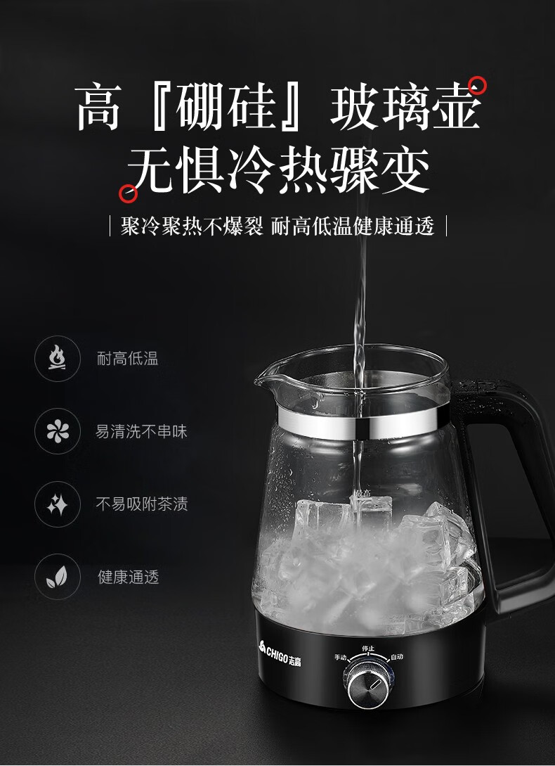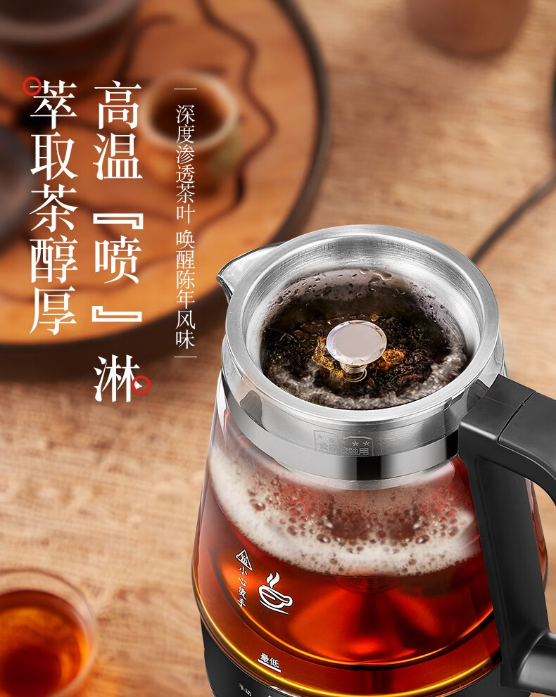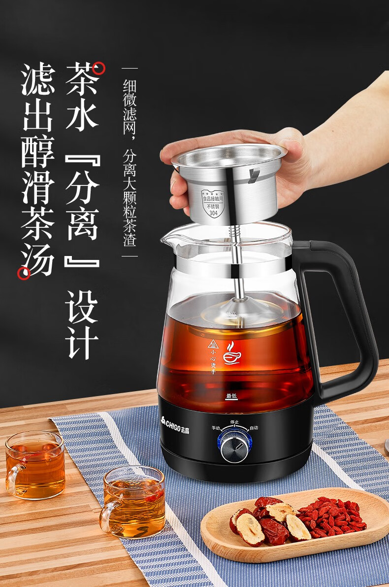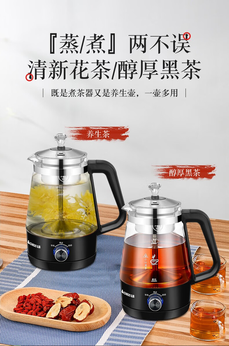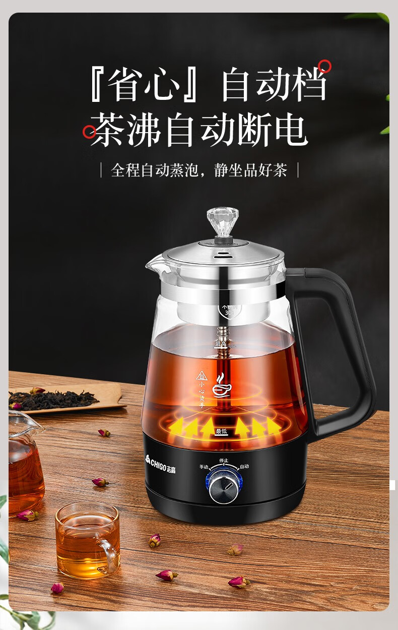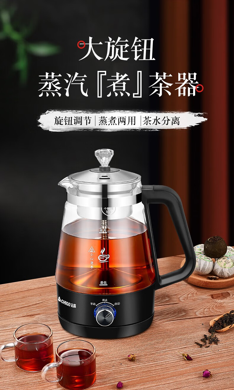 志高(CHIGO)蒸汽煮茶器智能喷淋式玻璃电热水壶不锈钢滤网黑茶壶电煮茶壶全自动泡茶养生壶 ZG-Z938黑色旋钮款
